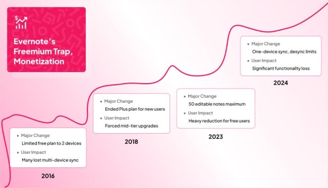 an infographics showing the evolution of Evernote's monetization